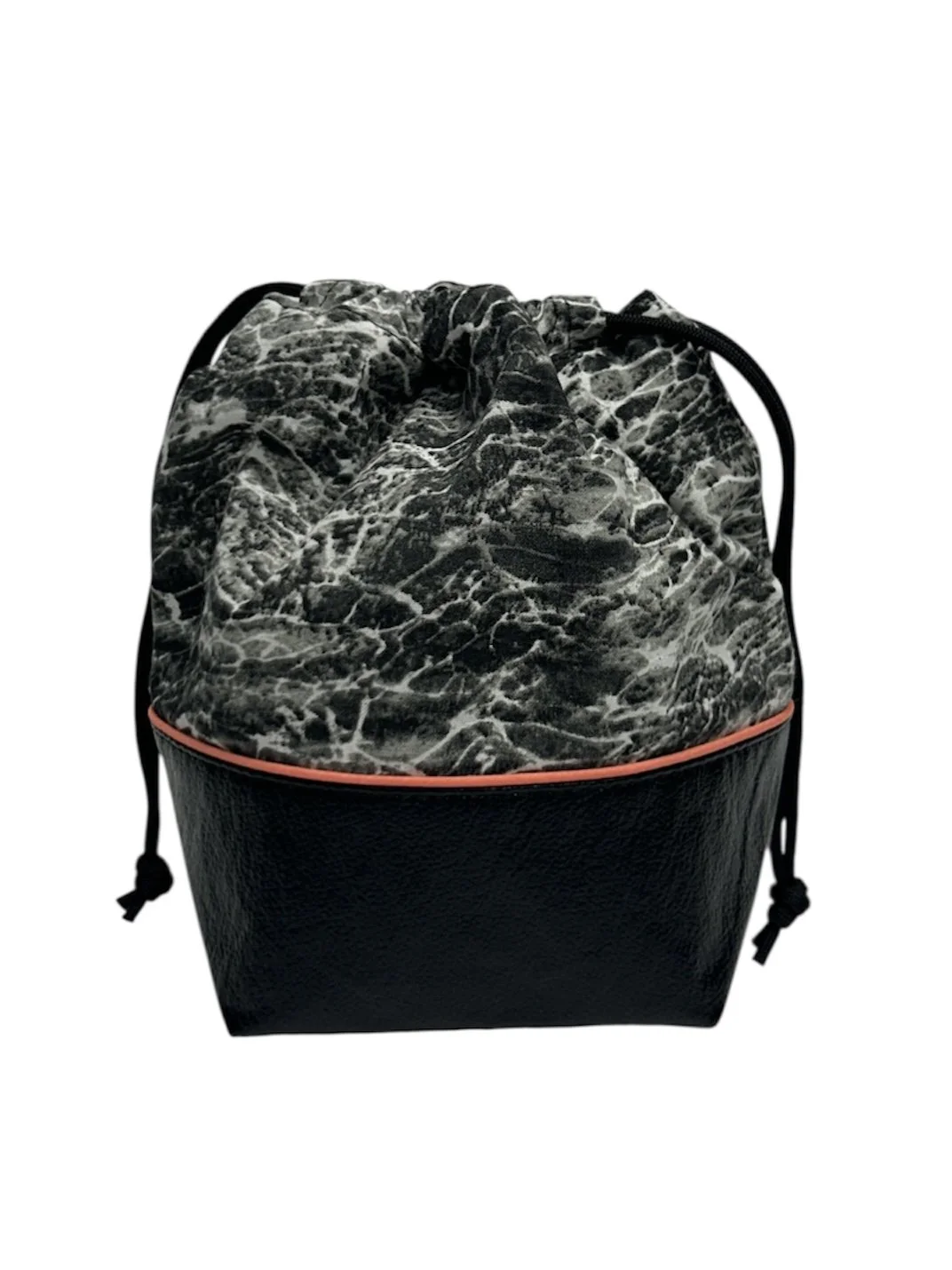 • Exterior is made with a durable vegan leather for the lower portion, and a printed cotton upper. Each bag features contrasting cotton piping