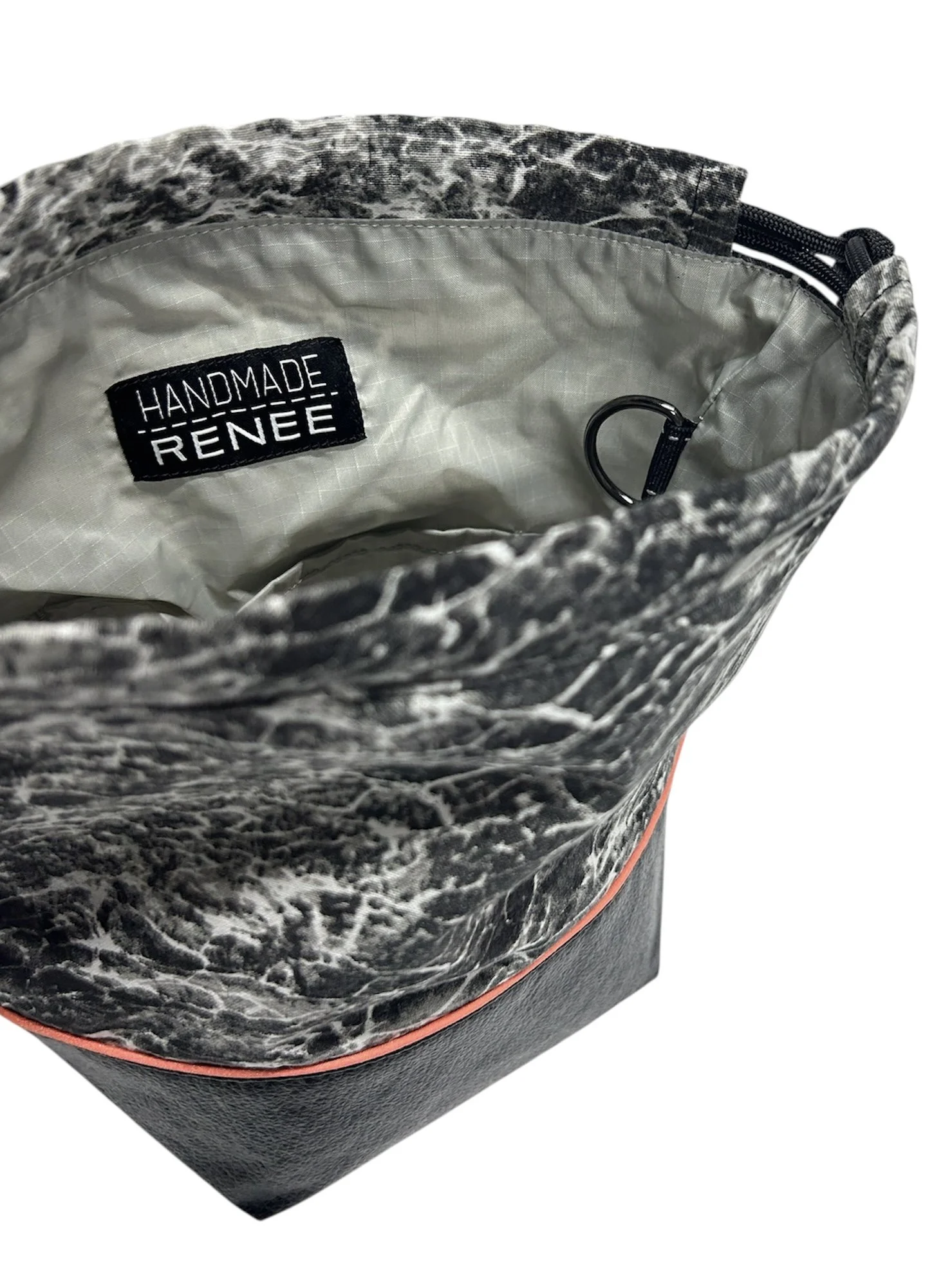 • D-ring for clipping stitch markers and notions is included on side interior of the bag